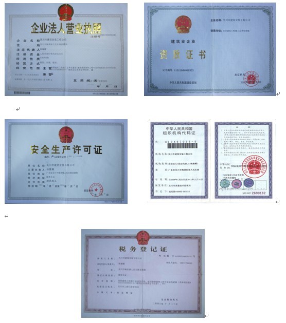 企業(yè)法人營(yíng)業(yè)執(zhí)照;資質(zhì)證書;安全生產(chǎn)許可證;組織機(jī)構(gòu)代碼證;稅務(wù)登記證: