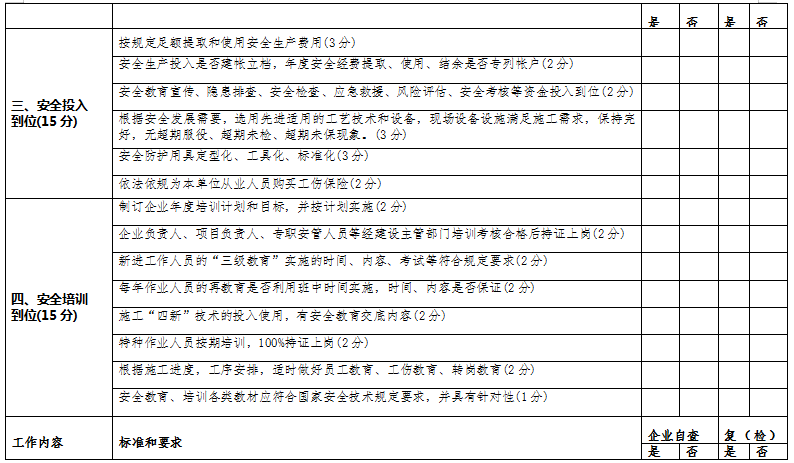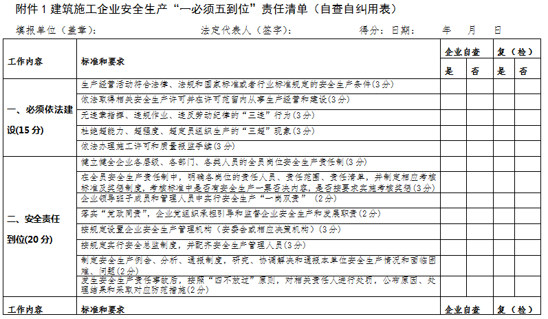 參建企業要深刻汲取省內外各類事故的慘痛教訓,改進安全生產工作上不認真、不扎實,走形式、走過場的問題,按照下列“一必須五到位”內容,對照附件1表格開展自查自糾自評,90分以上為“一必須五到位”達標。表格一式2份,由單位法人代表簽名并加蓋單位公章后,按照屬地管理原則,11月1日前報項目屬地主管部門1份,項目留存1份。自評不達標的企業,要自覺開展落實整改,整改存在困難或其他問題的,可向屬地主管部門咨詢求助,共同推進安全生產主體責任落實。