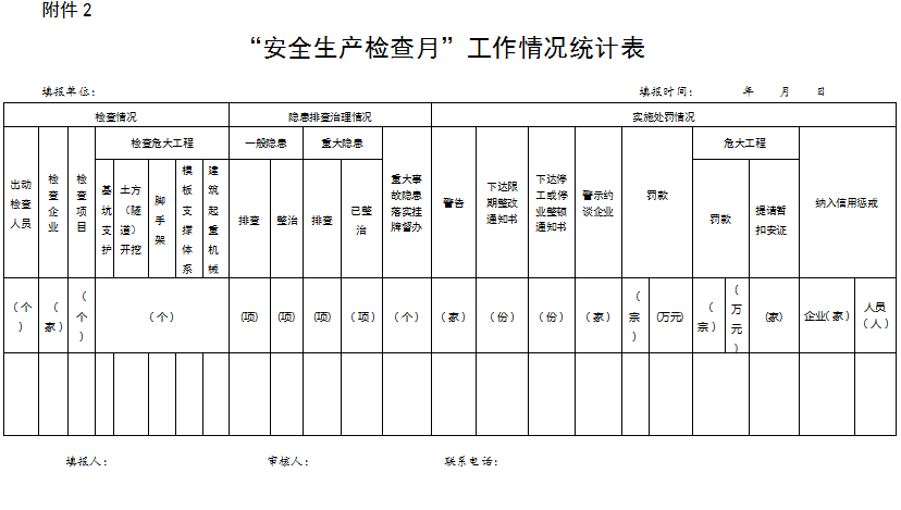 (三)夯實基礎,閉合整改,鞏固提升(11月上、中旬)。“安全生產檢查月”期間,我廳將對市縣(區)主管部門分管安全生產的相關負責同志開展培訓,助力各地提升安全生產監管效能。檢查工作結束后,各地有關部門對整治完成的隱患開展“回頭看”檢查,對重大事故隱患進行驗收和跟蹤督促,鞏固安全生產檢查成效。同時,對檢查工作進行認真總結,研究采取針對性措施解決工作中發現的問題并加快推動有關工作進度,逐步完善工作長效機制,并將“安全生產檢查月”工作情況統計表(見附件2)及總結報告于11月20日前報送我廳。
