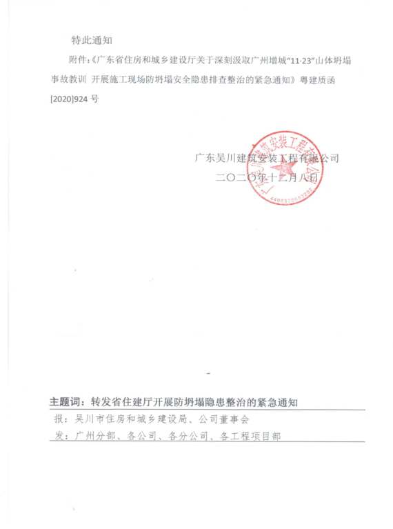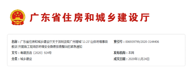 2020年11月23日下午,廣州市增城區(qū)派潭鎮(zhèn)金葉子酒店二期用地發(fā)生山體坍塌,造成4人死亡。據(jù)初步了解,事發(fā)的直接原因是突發(fā)山體坍塌導(dǎo)致1名正在察看工地的人員被埋后,趕往施救人員被二次山體坍塌掩埋。為堅(jiān)決杜絕類似事故再次發(fā)生,切實(shí)貫徹落實(shí)黨中央關(guān)于安全生產(chǎn)的工作部署和我省的工作要求,現(xiàn)就開展施工現(xiàn)場防坍塌安全隱患排查整治工作緊急通知如下: