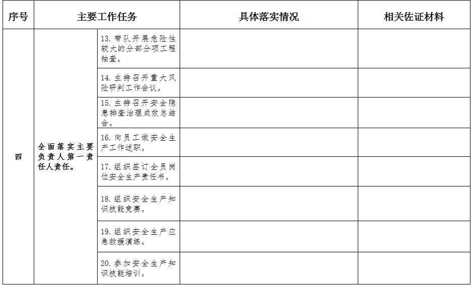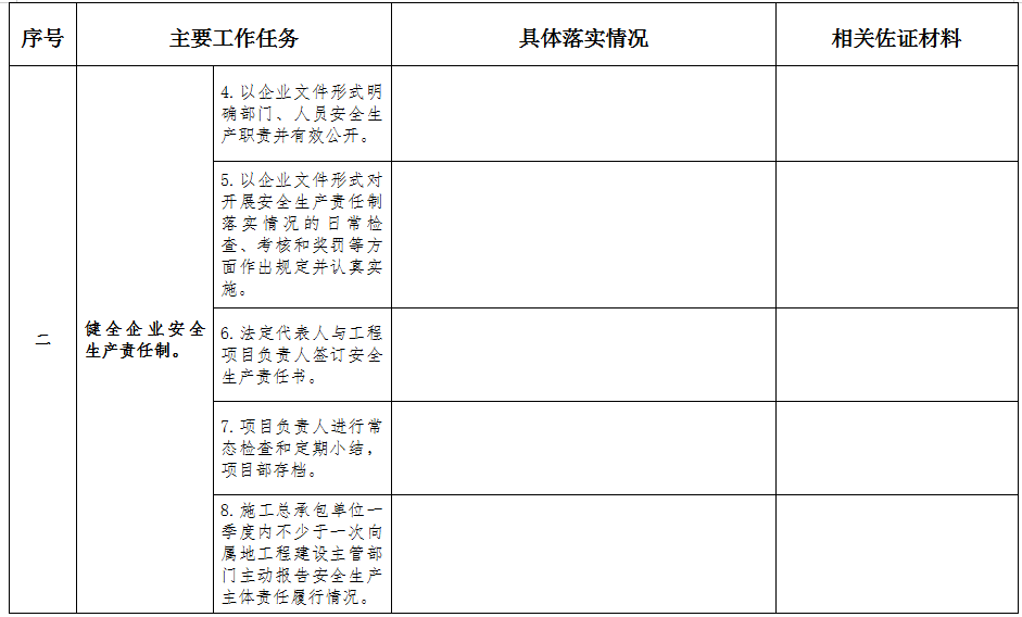 (二)健全企業安全生產責任制。一是以企業文件形式明確企業各層級負責人、企業安全生產有關職能部門及其人員、項目部安全生產管理機構及管理人員、作業人員的安全生產職責,項目部管理人員安全生產職責要在項目部上墻公開;二是以企業文件形式對開展安全生產責任制落實情況的日常檢查、考核和獎罰等方面作出規定并認真實施;三是企業法定代表人要與工程項目負責人簽訂安全生產責任書,明確安全生產目標、工作責任等;四是施工企業項目負責人要對項目部管理人員和作業人員履行安全生產職責情況進行常態檢查和定期小結,項目部應設置安全生產責任制落實情況文檔,存放相關文件資料;五是項目開工后,施工總承包單位一季度內不少于一次向屬地工程建設主管部門主動報告安全生產主體責任履行情況,包括企業負責人帶班檢查、項目負責人帶班生產、保障安全投入、風險預防和隱患排查整治、應急救援演練、人員教育培訓以及危大工程管控措施落實情況等。