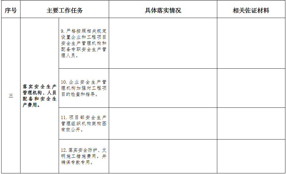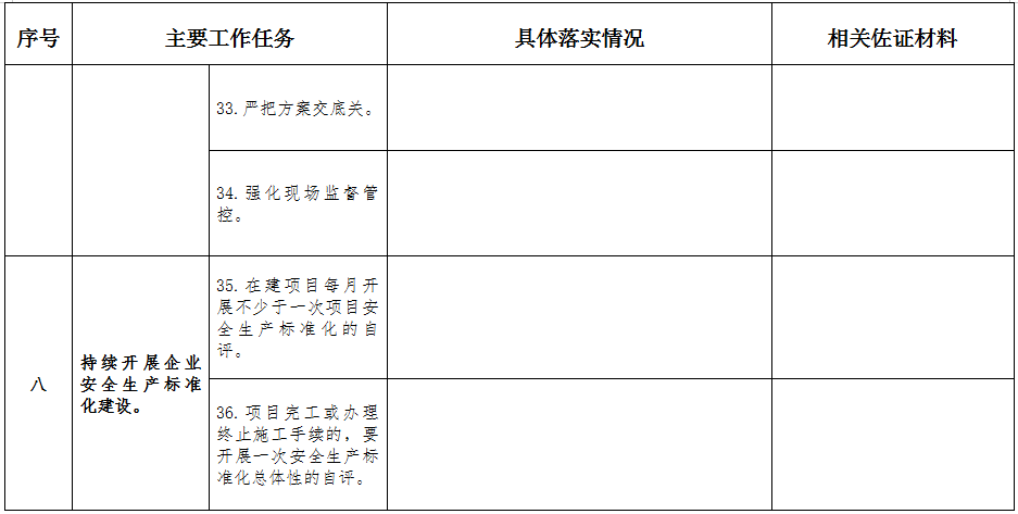 (二)自查自糾(2021年6月16日至9月30日)。各地各有關主管部門指導和督促所轄企業對照本方案工作任務扎實開展活動,認真查擺履行安全生產主體責任存在的問題和不足,及時落實整改,并于9月30日前填寫《“落實施工企業安全生產主體責任專項行動”開展情況(企業自查自糾用表)》(詳見附件)以及總結工作開展情況備查。