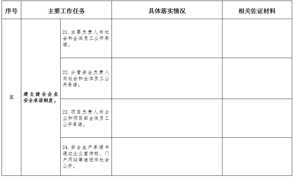 (五)建立健全企業安全承諾制度。建立完善主要負責人、分管安全負責人、項目負責人安全承諾制度。一是主要負責人就落實第一責任人責任、健全安全生產管理體系、確保安全生產投入及建立應急機制等情況向社會和全體員工公開承諾。二是分管安全負責人就履行安全生產責任、嚴格風險管控、強化隱患治理及開展全員安全教育等情況向社會和全體員工公開承諾。三是項目負責人就執行法律法規和標準規范、加強施工現場安全管理、落實各項安全管理制度及保障員工防護等情況向企業和項目部全體員工公開承諾。安全生產承諾書通過企業宣傳欄、門戶網站等途徑向社會公開。