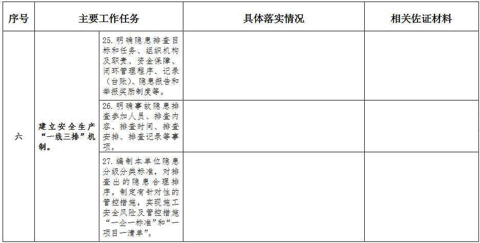 (六)建立安全生產“一線三排”機制。按照《廣東省生產經營單位安全生產“一線三排”工作指引》工作要求,深化企業和項目安全隱患排查治理。一是建立健全安全事故隱患排查制度,明確隱患排查的目標和任務、組織機構及職責、資金保障、閉環管理程序、記錄(臺賬)、隱患報告和舉報獎勵制度等;二是科學編制安全事故隱患排查計劃,明確參加人員、排查內容、排查時間、排查安排、排查記錄等事項;三是完善安全事故隱患排序機制,對照《廣東省應急管理廳關于安全風險分級管控辦法(試行)》隱患分級分類標準,細化編制本單位隱患分級分類標準,按照危害程度、整改難度對排查出的隱患合理排序,制定有針對性的管控措施,實現施工安全風險及管控措施“一企一標準”和“一項目一清單”;四是建立公司、分支機構、項目部、班組四級安全事故隱患排查治理機制,推動全員主動參與隱患排查治理,全程記錄報告隱患排查治理情況,實現隱患排查治理自查自改自報的閉環管理。