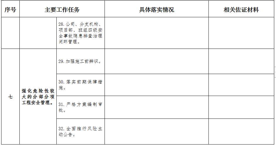 (七)強化危險性較大的分部分項工程安全管理。一是加強施工前辨識。施工單位應當在施工前辨識危大工程,編制危大工程專項施工方案,加強全過程管控。二是落實前期保障措施。施工單位應在投標時制訂危大工程清單并明確相應的安全管理措施,并在施工合同中明確及時支付危大工程施工技術措施費和相應的安全防護文明施工措施費的相應條款。三是嚴格方案編制審批。施工單位必須編制專項施工方案,經企業技術負責人和項目總監理工程師審批后組織施工;超過一定規模的危大工程專項施工方案必須組織專家論證。四是全面推行風險主動公告。危大工程施工前,施工總承包單位需在專項施工方案實施前5個工作日內,牽頭匯總分包單位和監理單位有關情況,向屬地工程建設主管部門書面報告危大工程的專項施工方案、人員到崗承諾、安全應急預案等。五是嚴把方案交底關。項目管理技術人員必須向作業人員進行安全技術交底,并由雙方和項目專職安全生產管理人員共同簽字確認。六是強化現場監督管控。施工單位項目負責人是危大工程安全管控第一責任人,危大工程施工期間必須在施工現場履職,超過一定規模的危大工程施工時,施工單位負責人應當帶班檢查。