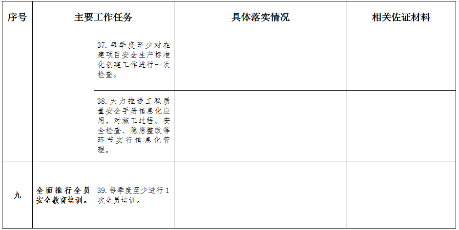 (八)持續開展企業安全生產標準化建設。按照住房城鄉建設部《建筑施工安全生產標準化考評暫行辦法》、省住房城鄉建設廳《建筑施工安全生產標準化評定工作實施細則》等文件的部署安排以及《企業安全生產標準化基本規范》(GB/T33000-2016)、《施工企業安全生產評價標準》(JGJ/T77-2010)、《建筑施工安全檢查標準》(JGJ59-2011)等標準規范要求,積極開展標準化創建和自檢自查工作。一是每月開展不少于一次項目安全生產標準化的自評;項目完工或辦理終止施工手續的,要開展一次安全生產標準化總體性的自評。二是每季度至少對施工項目安全生產標準化創建工作進行一次檢查,并將檢查結果及整改情況納入項目安全生產標準化總體性自評材料和企業本年度安全生產標準化自評當中。三是大力推進工程質量安全手冊信息化應用,對施工過程、安全檢查、隱患整改等環節實行信息化管理。
