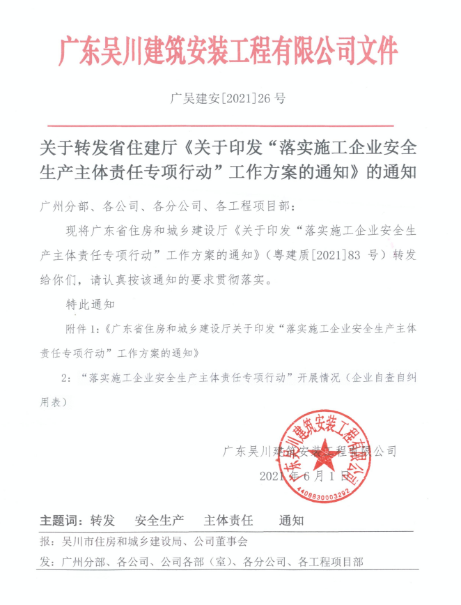 通過開展“落實施工企業安全生產主體責任專項行動”,指導和督促我省施工企業建立健全安全生產責任制,不斷完善自我約束的內生機制,形成責任體系更加健全、管理制度更加完善、關愛氛圍更加濃厚的安全生產新局面。