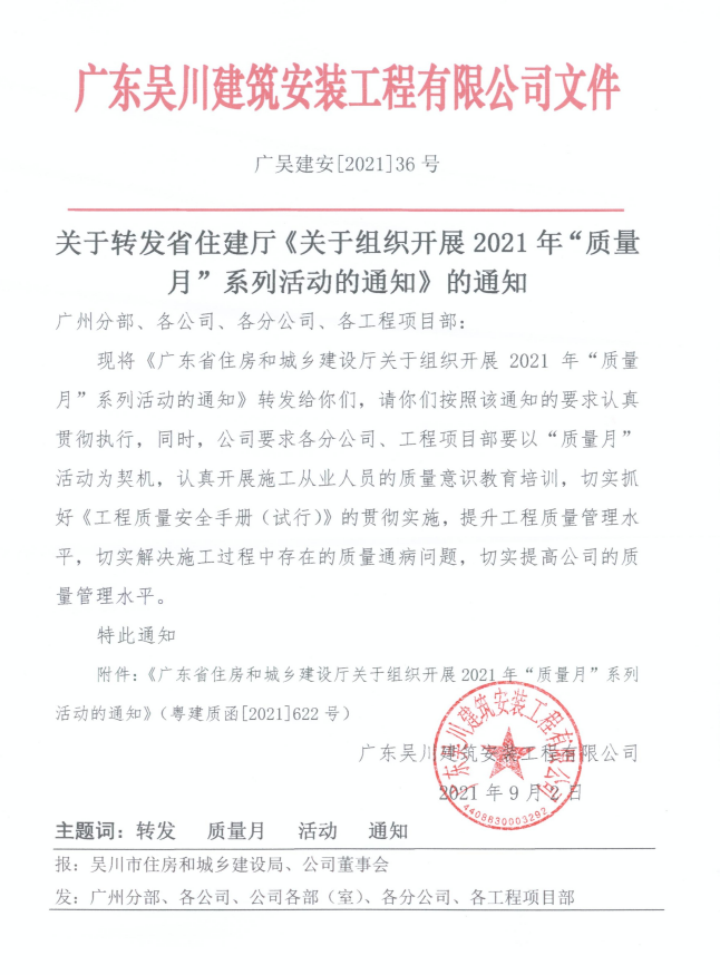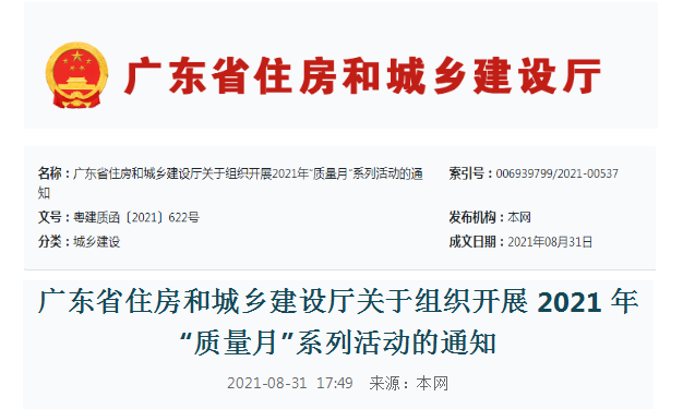 為深入貫徹習近平新時代中國特色社會主義思想,全面落實黨的十九大和十九屆二中、三中、四中、五中全會精神,牢固樹立“質量第一”的意識,不斷提升建筑工程品質,根據《市場監管總局等20個部門關于開展2021年全國“質量月”活動的通知》(國市監質〔2021〕51號),我廳決定于9月組織開展2021年全省住房城鄉建設系統“質量月”活動。現將有關事項通知如下: